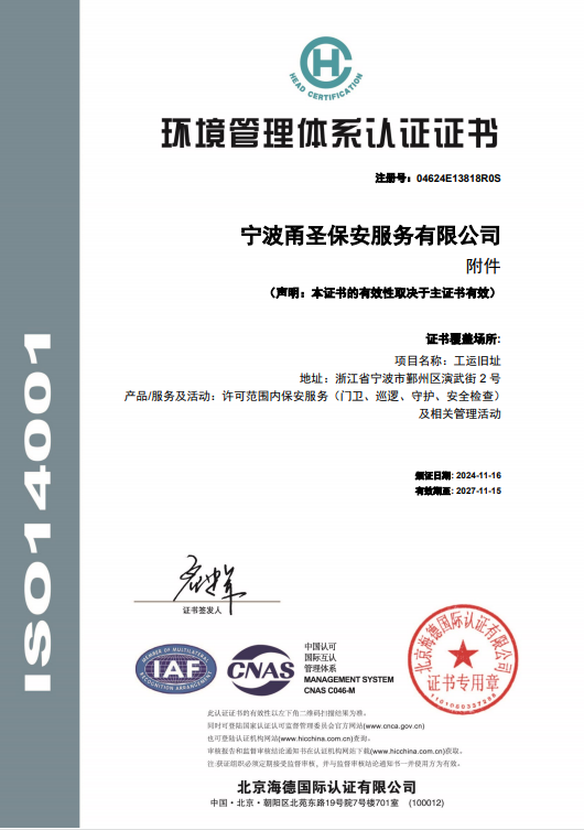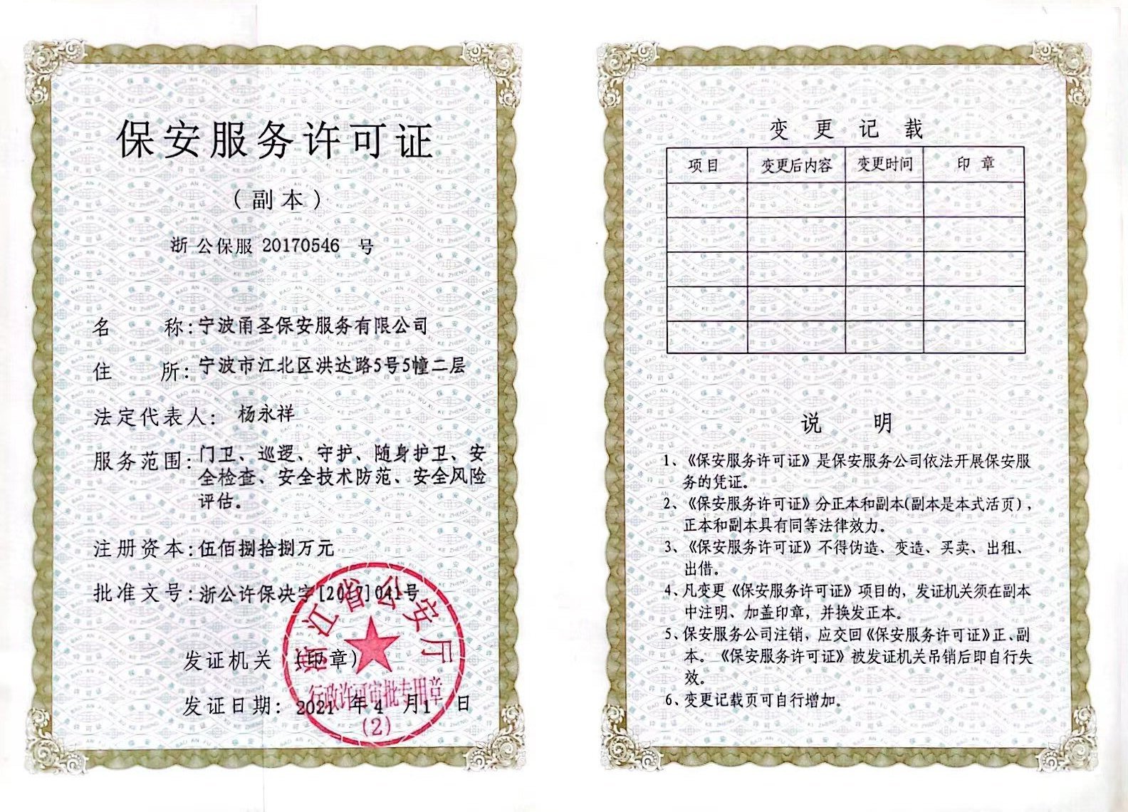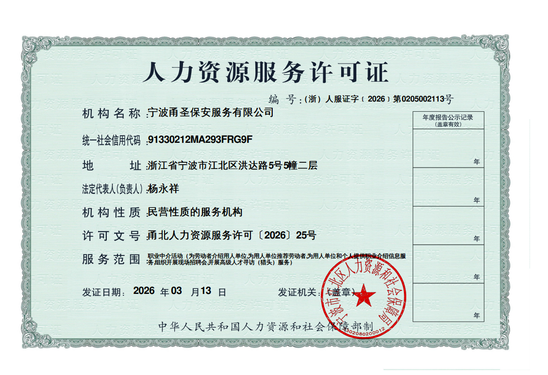 宁波甬圣保安服务有限公司是经浙江省公安厅批准、宁波市江北区市场监督管理局登记注册、具有独立法人资格的专业保安服务公司,是集人力安全防范服务、技术防范服务和特种保安服务为一体的宁波市一家具有现代服务理念、创新服务技能、科技技术应用的专业化、规范化、科学化的综合安保服务性企业。